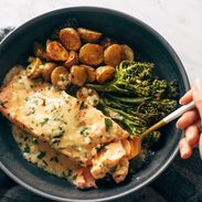 Delicious baked salmon with crispy potatoes, broccoli, and the most amazing life-changing lemon sauce smothered on top of it all. This is restaurant bistro-style eating!