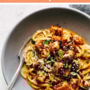 It starts with zoodles (zucchini noodles) tossedΒ with a thick and intensely deep spicy sesame peanut sauce that will then eventually get loaded up with crispy tofu that has been made crispy by just pan-frying it with the same spicy sesame peanut sauce, but waiting until those crispy browned bits appear in the pan / wondering if this is going to be weird / actually loving the texture of the browned bits in contrast with the tofu and sesame zoodles.