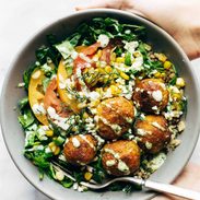 Source notes: This recipe was previously titled “Summer Bliss Bowls with Sweet Potato Falafel and Jalapeño Ranch” but was updated in August 2021 to better reflect and respect the cultural origins from which falafel came from. Falafel is a traditional Middle Eastern food that’s typically made from chickpeas, fava beans, or both, and is fried into a ball or fritter shape. Check out this recipe from Suzy at The Mediterranean Dish to make traditional falafel, step by step!